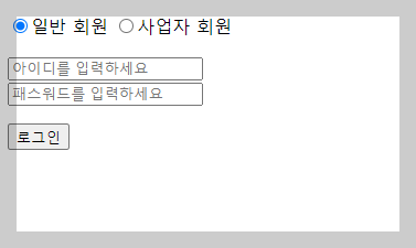 <body> <form id="frm" method="post" action="./loginok.do"> <p> <label><input type="radio" name="part" value="P" onclick="mb_part(this.value)" checked>일반 회원</label> <label><input type="radio" name="part" value="C" onclick="mb_part(this.value)">사업자 회원</label> </p> <p> <input type="text" name="mid" placeholder="아이디를 입력하세요"><br> <input type="text" name="mpass" placeholder="패스워드를 입력하세요"><br> <input type="text" name="corpno" placeholder="사업자 번호10자리를 입력하세요" maxlength="10" style="display:none;"> </p> <input type="button" value="로그인" onclick="js_submit()"> </form> </body> <script type="text/javascript"> var option= "";//radio를 선택하는 값을 받는 전역변수 function mb_part(pt){ option = pt; if(pt == "C"){ frm.corpno.style.display = "block"; }else{ frm.corpno.style.display = "none"; } } function js_submit(){ if(frm.mid.value==""){ alert("아이디를 입력하세요"); }else if(frm.mpass.value==""){ alert("패스워드를 입력하세요"); }else{ //전역변수의 값을 체크하여 일반,사업자 확인 후 전송 if(option == "C"){ if(frm.corpno.value=="" || frm.corpno.value.length < 10){ alert("사업자번호 10자리를 입력하셔야합니다"); frm.corpno.value=""; frm.corpno.focus(); }else{ frm.submit(); } }else{ frm.submit(); } } } </script>