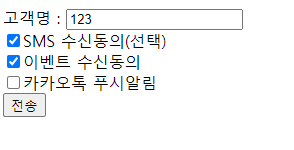 <body> <form method="get" id="frm" action="./step2.html"> 고객명 : <input type="text" name="user"><br> <input type="checkbox" name="sms" value="Y">SMS 수신동의(선택)<br> <input type="checkbox" name="event" value="Y">이벤트 수신동의<br> <input type="checkbox" name="kakao" value="Y">카카오톡 푸시알림<br> <input type="button" value="전송" onclick="gopage()"> </form> </body> <script type="text/javascript"> function gopage(){ frm.submit(); } </script>