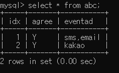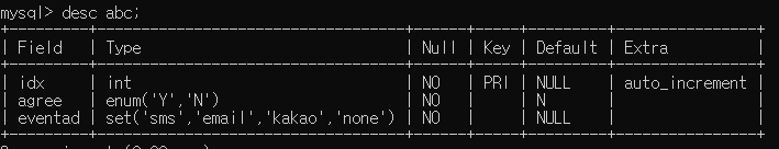 create table abc( idx int(5) not null auto_increment, agree enum('Y','N') not null default 'N', //radio eventad set('sms','email','kakao','none') not null, // checkbox primary key(idx) ); ▼ insert into abc values ('0','Y','sms,email'); // 복수 선택 가능 insert into abc values ('0','Y','kakao');