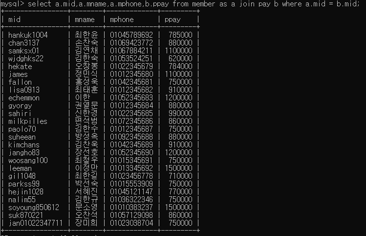 select a.mid,a.mname,a.mphone,b.ppay from member as a join pay b where a.mid = b.mid group by a.mid,a.mname,a.mphone,b.ppay;