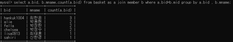 select a.bid, b.mname,count(a.bid) from basket as a join member b where a.bid=b.mid group by a.bid , b.mname;