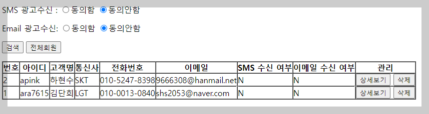 ⚡ sms,이메일 수신여부에 따른 회원정보 리스트 출력 파트(select)
