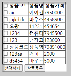 <title>상품 정보 출력 리스트 페이지 B - list 출력 및 체크박스 선택삭제 가능 기능</title>