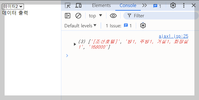 eval로 front-end에서 받을시 <script>태그는 사용 X !!String data1 = "[조선호텔]"; String data2 = "방1, 주방1, 거실1, 화장실1"; String data3 = "168000"; pw.write("var data = new Array();" //<script> 넣으면 안됨 + "data.push('"+ data1 +"');" + "data.push('"+ data2 +"');" + "data.push('"+ data3 +"');"); /* 반복문 사용도 가능 pw.write("var data = new Array();"); int w=0; while(w<3) { pw.write("data.push('"+ data1 +"');"); //ajax로 response 받는 값 w++; } */