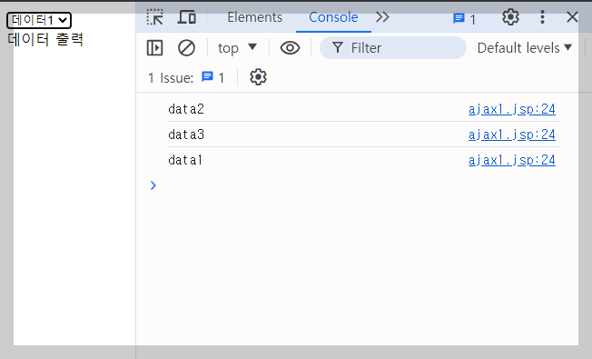 <body> <select onchange="infodata(this.value)"> <option value="data1">데이터1</option> <option value="data2">데이터2</option> <option value="data3">데이터3</option> </select> <div id="dataload"> 데이터 출력 </div> </body> <script> function infodata(z){ var http,result; http = new XMLHttpRequest(); http.onreadystatechange = function(){ if(http.readyState==4 && http.status==200){ eval(this.response); console.log(data); } } http.open("post","./ajax2.do",true); http.setRequestHeader("content-type","application/x-www-form-urlencoded"); http.send("idx="+z); } </script>