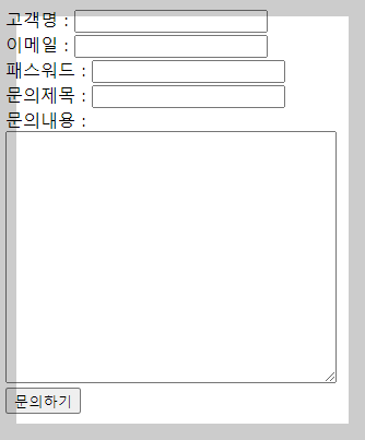 <form id="frm"> 고객명 : <input type="text" name="ename"><br> 이메일 : <input type="text" name="fromemail"><br> 패스워드 : <input type="text" name="epass"><br> 문의제목 : <input type="text" name="subject"><br> 문의내용 : <br><textarea name="mailtext" rows="15" cols="40"></textarea><br> <input type="button" value="문의하기" onclick="mail_post()"> </form> </body> <script type="text/javascript"> function mail_post(){ frm.method="post"; frm.action="./qamailok.do"; frm.submit(); } </script>