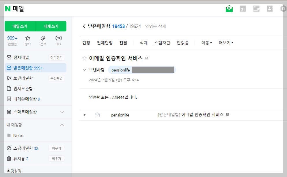 - send_email.do (servlet 파일)@WebServlet("/send_email.do") public class send_email extends HttpServlet { private static final long serialVersionUID = 1L; protected void doPost(HttpServletRequest request, HttpServletResponse response) throws ServletException, IOException { request.setCharacterEncoding("utf-8"); response.setContentType("text/html;charset=utf-8"); //전송할 인증번호 String random = rnd_key(); String ename = "pensionlife"; String fromemail = ""; //보내는 사람 이메일 작성 String mailtext = "인증번호는 : " + random + "입니다."; String subject = "이메일 인증확인 서비스"; //메일서버(기본정보) String host = "smtp.mail.nate.com"; String login_user = ""; //실제 로그인 아이디 String login_pass = ""; //실제 로그인 비번 String to_mail = request.getParameter("toemail"); //메일서버 SMTP 셋팅 설정값 Properties pp = new Properties(); pp.put("mail.smtp.host", host); //메일서버 도메인 주소-이방법은 실제 잘 쓰진 않음 pp.put("mail.smtp.port", 587); //메일서버 전송 port번호 pp.put("mail.smtp.auth", "true"); //로그인에 대한 암호화 사용 pp.put("mail.smtp.debug", "true"); //메일 회신 주소가 잘못되어 반송되는 사항 pp.put("mail.smtp.socketFactory.port", 587); //메일 발송에 대한 소켓포트통신 //TLS : 전송 통신 보안 정책 pp.put("mail.smtp.ssl.protocals", "TLSv1.2"); Session ss = Session.getDefaultInstance(pp, new Authenticator() { @Override protected PasswordAuthentication getPasswordAuthentication() { return new PasswordAuthentication(login_user, login_pass); } }); try { MimeMessage msg = new MimeMessage(ss); //보내는 사람의 정보 (이메일,이름) msg.setFrom(new InternetAddress(fromemail,ename)); //받는 사람의 정보 msg.addRecipient(Message.RecipientType.TO, new InternetAddress(to_mail)); msg.setSubject(subject); //메일 제목 msg.setText(mailtext); //메일 내용 Transport.send(msg); //메일 발송 //난수 ajax로 출력 PrintWriter pw = response.getWriter(); pw.write(random); pw.close(); }catch(Exception e) { System.out.println("메일발송 실패!!"); } } public String rnd_key() { //난수4자리 생성 String rnd =""; int w=1; while(w<=6) { int no = (int)Math.floor(Math.random()*10); rnd += no; w++; } return rnd; } }