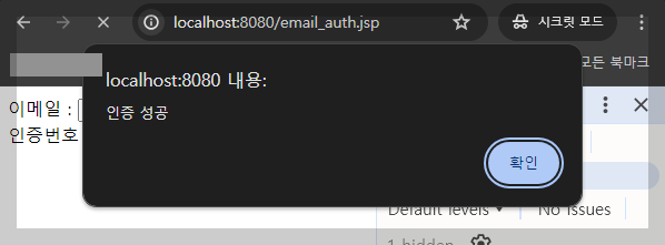 <body> 이메일 : <input type="text" name="toemail" id="toemail"> <input type="button" value="인증하기" onclick="sendemail()"><br> 인증번호 : <input type="text" name="number" id="my_num"> <input type="button" value="확인" onclick="ck_number()"> </body> <script type="text/javascript"> var number = ""; function sendemail(){ var toemail = document.getElementById("toemail").value; var http,result; http = new XMLHttpRequest(); http.onreadystatechange = function(){ if(http.readyState==4 && http.status==200){ number = this.response; alert("메일로 인증번호를 전송 완료했습니다"); } } http.open("post","./send_email.do",true); http.setRequestHeader("content-type","application/x-www-form-urlencoded"); http.send("toemail="+toemail); } function ck_number(){ if(number == document.getElementById("my_num").value){ location.href="./email_auth.jsp"; alert("인증 성공"); }else{ alert("인증 실패") } } </script>