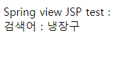 test.jsp<%@ page language="java" contentType="text/html; charset=UTF-8" pageEncoding="UTF-8"%> <!DOCTYPE html> <html> <head> <meta charset="UTF-8"> <title>Insert title here</title> </head> <body> Spring view JSP test <br> 검색어 : ${search} <br> </body> </html>