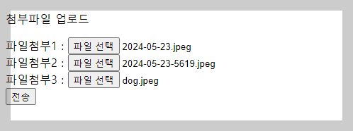 <body> <form id="frm" method="post" action="./fileupok2.do" enctype="multipart/form-data"> <p>첨부파일 업로드</p> 파일첨부1 : <input type="file" name="mfile"><br> 파일첨부2 : <input type="file" name="mfile"><br> 파일첨부3 : <input type="file" name="mfile"><br> <!-- 둘다 받는 방식 동일! --> 파일첨부 multiple : <input type="file" name="mfile" multiple="multiple"><br> <input type="button" value="전송" onclick="fileupload()"> </form> </body> <script> function fileupload(){ frm.submit(); } </script>