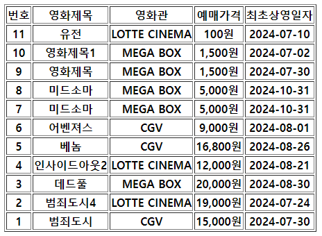 - ecma_7.jsp - list 출력 페이지<%@ page language="java" contentType="text/html; charset=UTF-8" pageEncoding="UTF-8"%> <%@ taglib prefix="cr" uri="http://java.sun.com/jsp/jstl/core" %> <%@ taglib prefix="fn" uri="http://java.sun.com/jsp/jstl/functions" %> <%@ taglib prefix="fmt" uri="http://java.sun.com/jsp/jstl/fmt" %> <!DOCTYPE html> <html> <head> <meta charset="UTF-8"> <title>무비 정보 리스트 출력 - ECMA + JSTL</title> </head> <body> <table border="1"> <thead> <tr> <th>번호</th> <th>영화제목</th> <th>영화관</th> <th>예매가격</th> <th>최초상영일자</th> </tr> </thead> <tbody> <cr:forEach var="m" items="${all}" varStatus="no"> <tr> <th>${count-no.index}</th> <th>${m.get(1)}</th> <th>${m.get(2)}</th> <th> <fmt:formatNumber value="${m.get(3)}" pattern="#,###"/>원 </th> <th>${m.get(4)}</th> </tr> </cr:forEach> </tbody> </table> </body> </html>