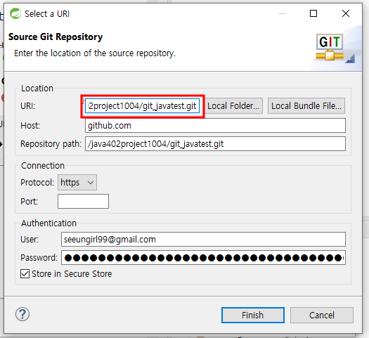 -> Git/Projects from Git 선택 -> Clone URI -> github의 code url 복붙 및 user,password 입력
