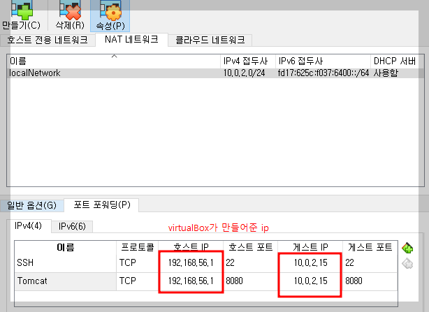 window ip ==> virtualBox가 만들어준 ip ==> 원격으로 다른 서버 (지정port의 ip - 게스트 ip) 접속 가능