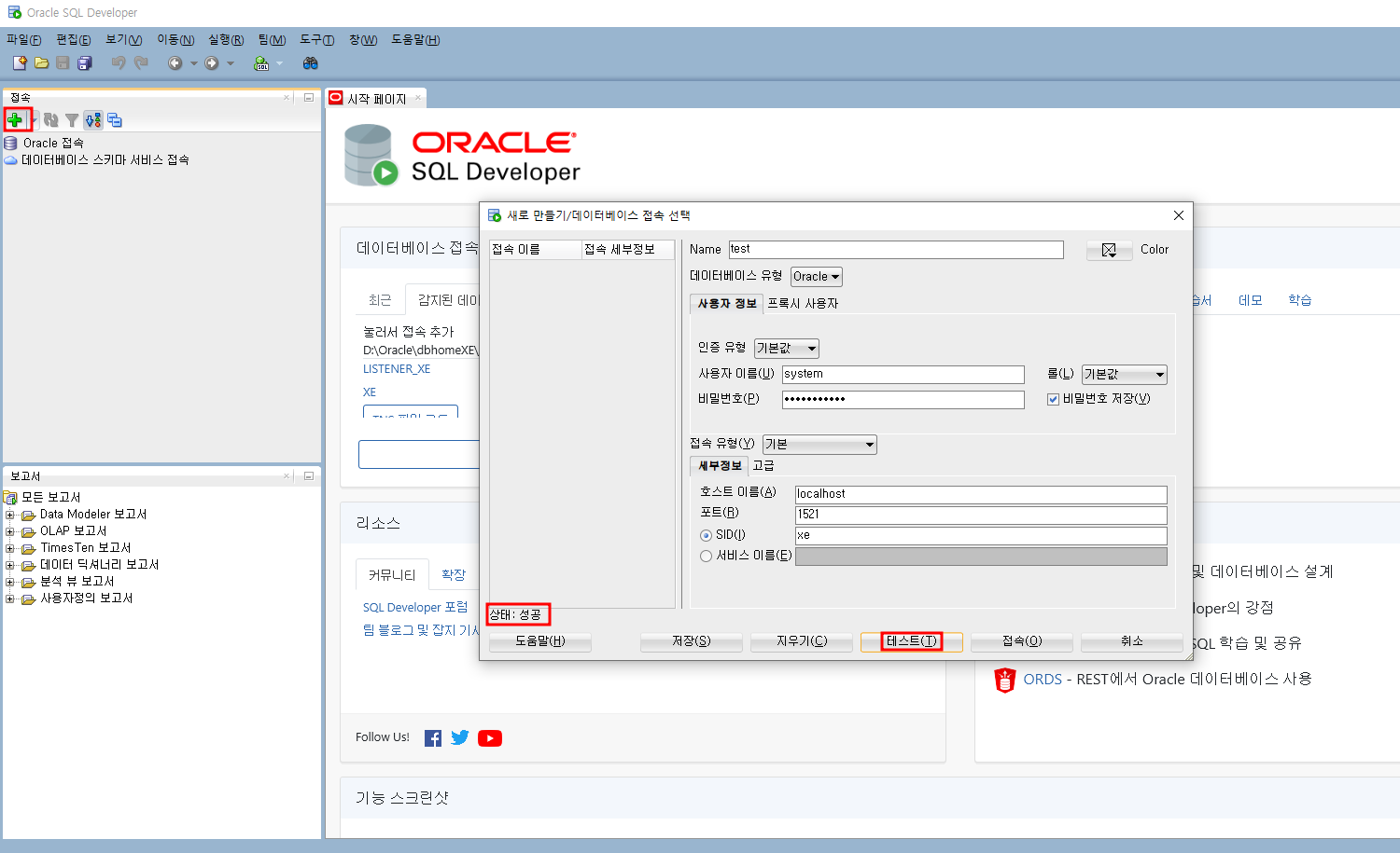 - sqldeveloper 에서 + 버튼 , 연결 테스트 - 하단 이미지 참고