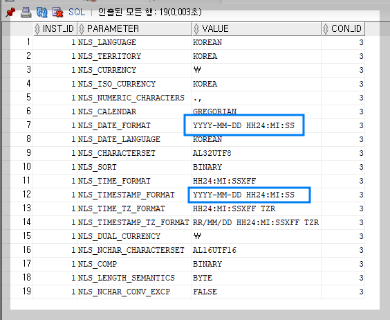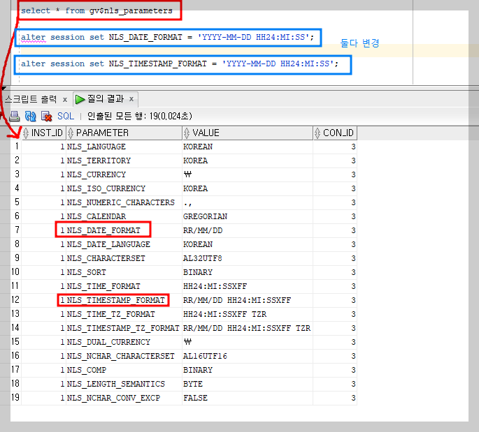 날짜 형식변경해서 출력 - select * from gv$nls_parameters (요걸로 확인해서)