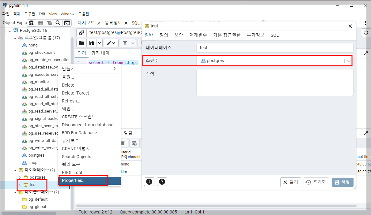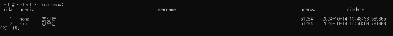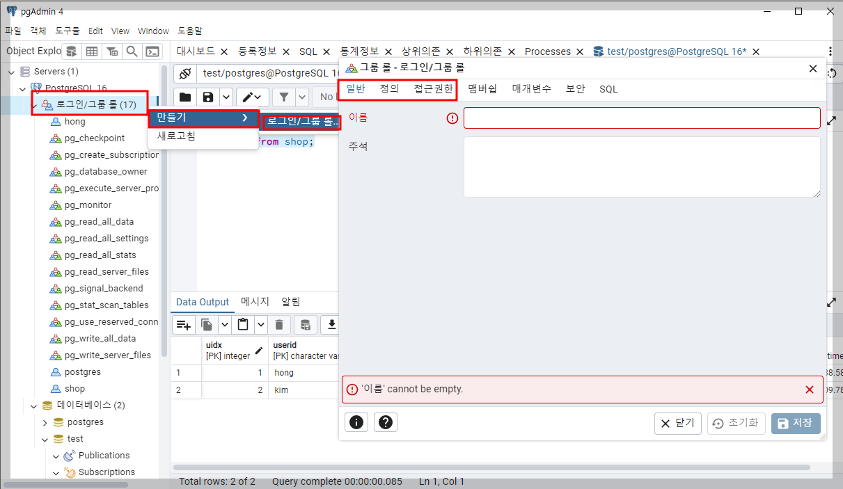 => 권한 갖을 database도 만들어줘야 hong으로 접속 가능!! : \c test hong; (test라는 database에 권한 넣어줌)
