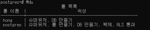 psql -U postgres => 최고 관리자로 로그인
