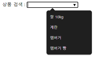 <!-- type:text와 datalist 태그를 결합하여 조건검색 형태의 오브젝트를 생성 (input type text의 list값과 datalist의 id값 동일하게) HTML5전용태그 --> 상품 검색 : <input type="text" name="search" list="data"> <datalist id="data"> <option>쌀 10kg</option> <option>계란</option> <option>햄버거</option> <option>햄버거 빵</option> </datalist>