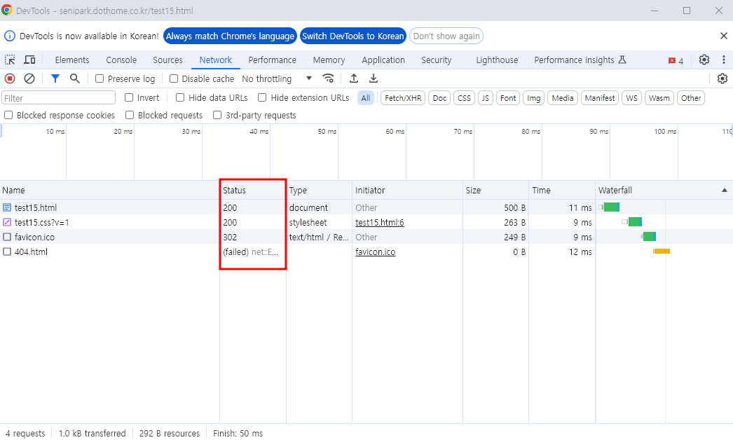 * 파일이 올바르게 다 연결된 경우 개발자도구의 Network -> status가 200뜸