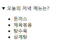 <!-- ul,ol 결합 details : 세부정보를 표시할 때 사용하는 태그 summary : 목록 타이틀 ul : 목차/ li : 리스트 display none/block 처리하는것처럼 클릭시 사라졌다 나왔다 함 모바일에서 주로 사용 HTML5 전용태그 --> <details> <summary>오늘의 저녁 메뉴는?</summary> <ul> <li>돈까스</li> <li>제육볶음</li> <li>탕수육</li> <li>삼계탕</li> </ul> </details>