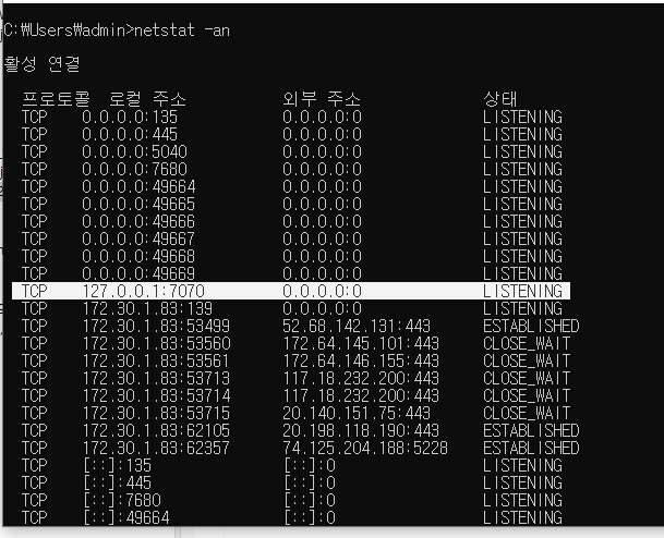 (cmd로 열려있는지 닫혀있는지 확인 netstat -an) - TCP : 외부 연결 프로토콜 (전송속도 빠름)