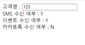 - getElementsByName : name은 기본이 원시배열 형태를 구성함 ex) abc[0].value<body> <form id="frm"> <input type="hidden" name="sms" value="N"> <input type="hidden" name="event" value="N"> <input type="hidden" name="kakao" value="N"> 고객명 : <input type="text" name="person" readonly><br> SMS 수신 여부 : <span id="sms">N</span> <br> 이벤트 수신 여부 : <span id="event">N</span> <br> 카카토톡 수신 여부 : <span id="kakao">N</span> </form> </body> <script type="text/javascript"> //javascript에서 url 값 중 URI(파라미터)값만 확인하는 함수 var data = window.location.search; //한글 인식이 어렵다 //배열로 출력 : 값을 몇개 체크하느냐에 따라 배열의 갯수 달라짐(& 기호는 사라짐) var data_sp = data.split("&"); var nm = data_sp[0].split("="); //readonly input에 값 넣음(한글이면 깨지기 때문에 decode해서 넣어줌) frm.person.value = decodeURIComponent(nm[1]); if(data_sp.length > 1){ //체크박스 하나라도 체크 var f; //첫밴째배열[0]은 체크박스가 아니므로 이미 처리 완료 -> 그 외의 배열 검토 for(f=1; f<data_sp.length; f++){ var arr = data_sp[f].split("="); //step1의 name과 step2의 id값을 동일하게 맞춤 //data_sp의 ["email","Y"] 중 1번째 값과 일치하는 id값에 innerHTML document.getElementById(arr[0]).innerHTML = arr[1]; document.getElementsByName(arr[0])[0].value = arr[1]; } } </script>