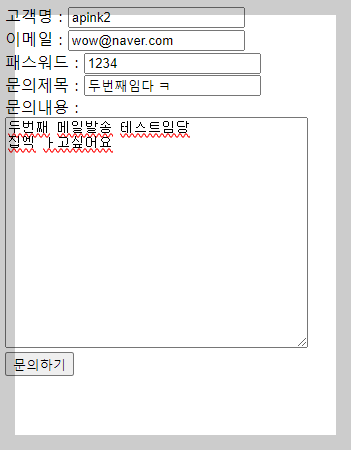 <form id="frm"> 고객명 : <input type="text" name="ename"><br> 이메일 : <input type="text" name="fromemail"><br> 패스워드 : <input type="text" name="epass"><br> 문의제목 : <input type="text" name="subject"><br> 문의내용 : <br><textarea name="mailtext" rows="15" cols="40"></textarea><br> <input type="button" value="문의하기" onclick="mail_post()"> </form> </body> <script type="text/javascript"> function mail_post(){ frm.method="post"; frm.action="./qamailok.do"; frm.submit(); } </script>