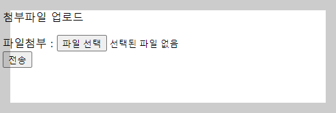 <body> <form id="frm" method="post" action="./fileupok.do" enctype="multipart/form-data"> <p>첨부파일 업로드</p> 파일첨부 : <input type="file" name="mfile"><br> <input type="button" value="전송" onclick="fileupload()"> </form> </body> <script> function fileupload(){ frm.submit(); } </script>
