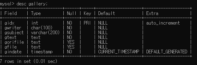 sql = "insert into gallery (gidx,gwriter,gsubject,gtext,gindate)"