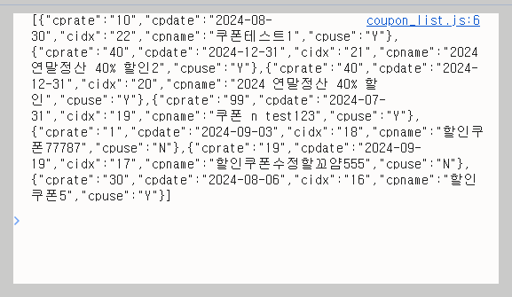 이렇게 문자로만 주욱-- 찍힘 => frot에서 JSON.parse() 로 받아야함