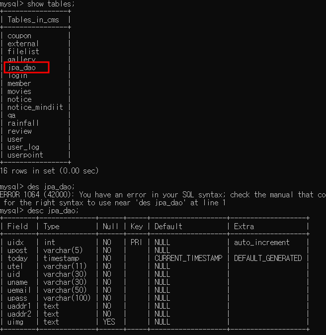 @Table 어노테이션을 작성하지 않아 class명인 jpa_dao 가 table명으로 생성됨